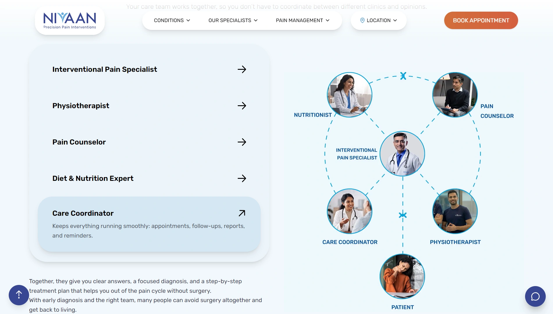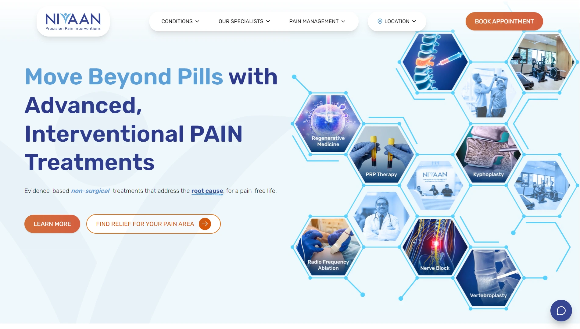 Nivaan Care is a non-surgical pain management and rehabilitation clinic focused on treating chronic musculoskeletal conditions such as back pain, knee pain, neck pain, and joint-related disorders. The clinic emphasizes evidence-based, non-invasive treatments supported by patient education and long-term recovery outcomes.