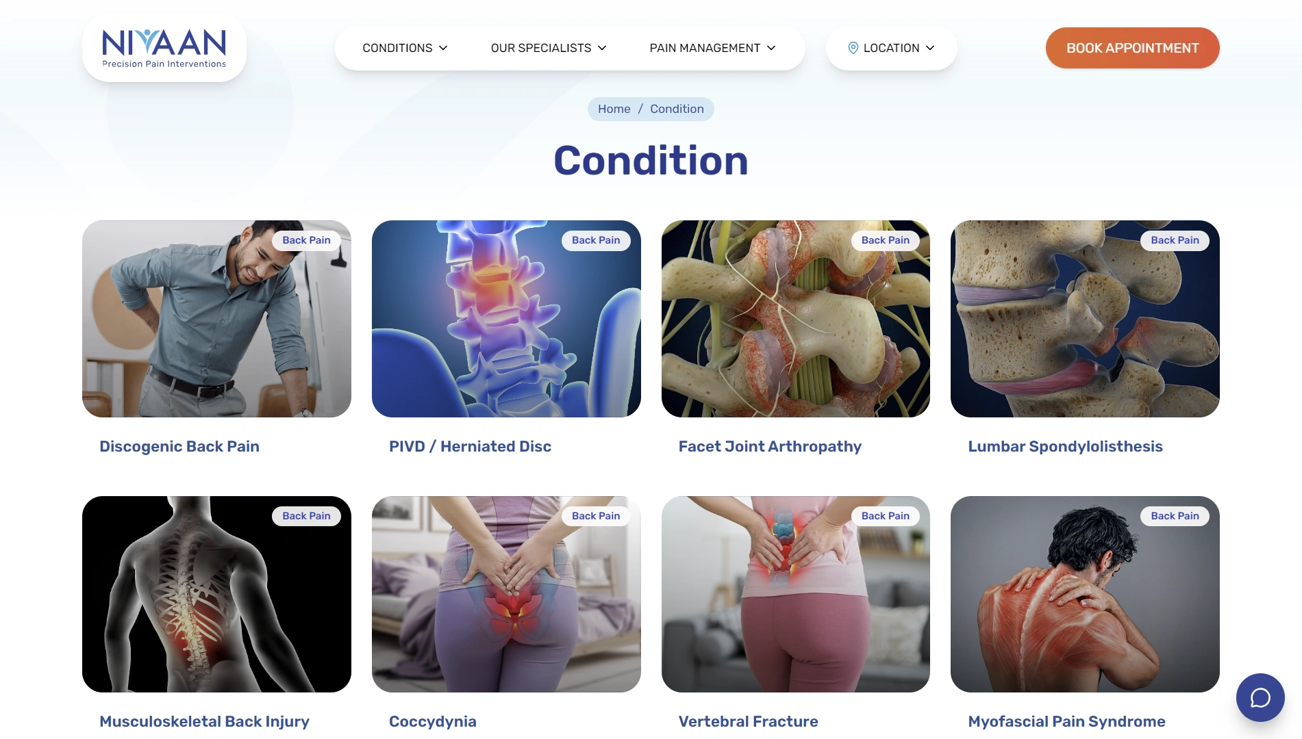 - Structured condition and treatment pages for major pain areas